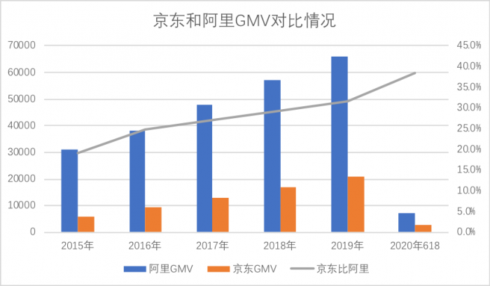 2020年618,阿里首次披露了交易额,虽然大幅领先京东,但从数值看,双方的差距逐步缩小的趋势并未有所改变,值得注的是,根据阿里和京东公布的GMV情况,两家公司618总交易额已超过9600亿元,几乎是上年6月电商的总交易量,虽说GMV较最终交易会在退换货等方面有所折扣,但2020年618大幅超过往年也是明确的。