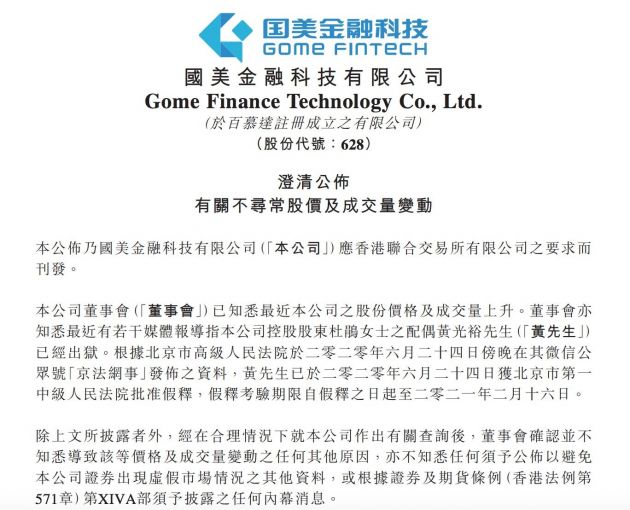 6月26日消息,今日早间,国美金融科技在港交所发布公告称,国美金融科技发布公告表示,已知悉最近公司股份价格及成交量上升,亦知悉最近有媒体报导黄光裕先生已出狱,公司自北京市高级人民法院2020年6月24日在其官方微信公众号“京法网事”发布的信息获悉,北京市第一中级人民法院已裁定对黄先生予以假释,假释考验期限自假释之日起至2021年2月16日止。