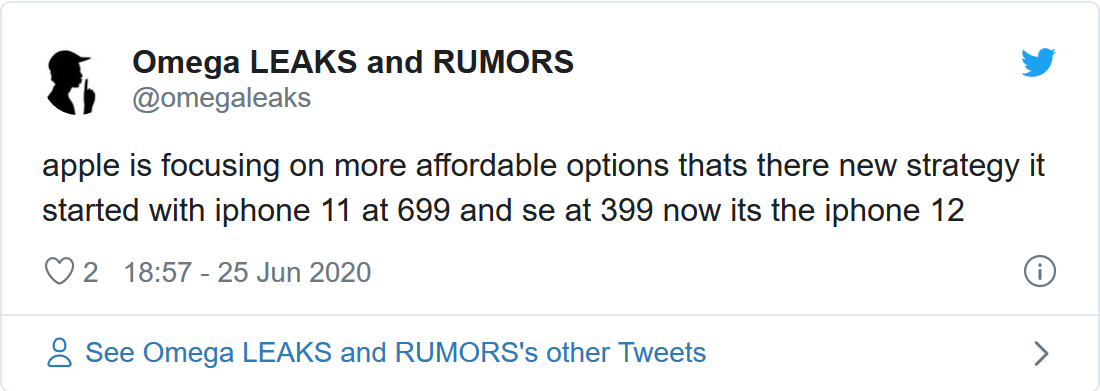 据外媒报道,Twitter账号@omegaleaks日前发文称自己拥有一些关于iPhone 12的新信息。据其披露,苹果将推4G版iPhone 12和iPhone 12 Max以便为消费者带来更便宜的机型选择。据悉,该账号刚注册不久。 按照@omegaleaks的说法,这两款手机的售价将分别为549美元和649美元。