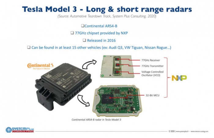 在雷达模组上,特斯拉求稳心态也暴露无遗,它们选择了大陆集团的 ARS4-B。ARS4-B 用到了 77GHz 的雷达芯片组与恩智浦的 32-bit MCU。Fraux 指出,虽然联发科与德州仪器都对车载芯片市场虎视眈眈,但恩智浦与英飞凌依然是无可争议的领先者。大陆集团则在雷达模组上优势巨大。ARS4-B 至少已登陆 15 款车型,包括奥迪 Q3,大众途观、日产奇骏等重量级产品。