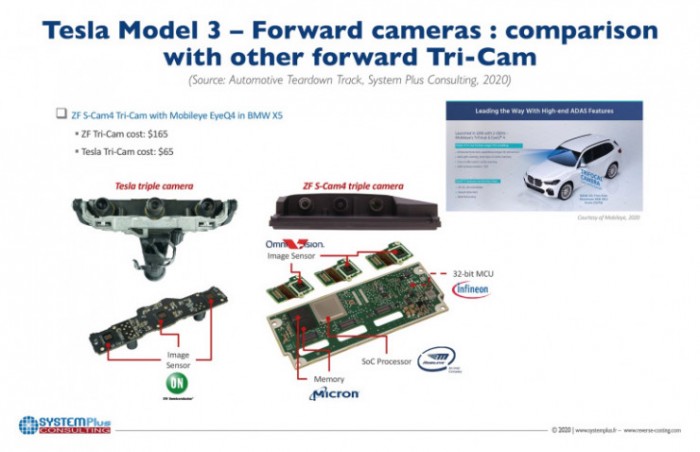 为了进行一番比较,System Plus 找了采埃孚的 S-Cam4 三摄系统。这套系统搭载了 Omnivision 的 COMS 传感器与 Mobileye 的 EyeQ4 视觉处理器。