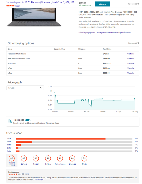希望找到某样商品,只需要将网络上的图片保存上传,或者将自己相机中拍下的图片上传就可以开始搜索商品并找到所有卖家的最佳价格。当产品出现降价时,Bing还将通过电子邮件和浏览器通知。