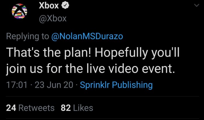 今年五月,微软通过网络视频聊天的形式举办了Inside Xbox节目。现在看来,Xbox七月活动将延续直播的形式,不过形式尚未公布。Xbox官方推特已经发文表明这将是一场“直播视频活动”。
