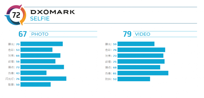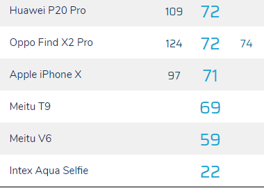 72分的表现是个什么样的情况呢?在前置自拍排行榜中,这个成绩只能排到34位,或者是倒数第五,比它差的啊只有iPhone X、美图T9、美图V6及Intex Aqua Selfie这4个。