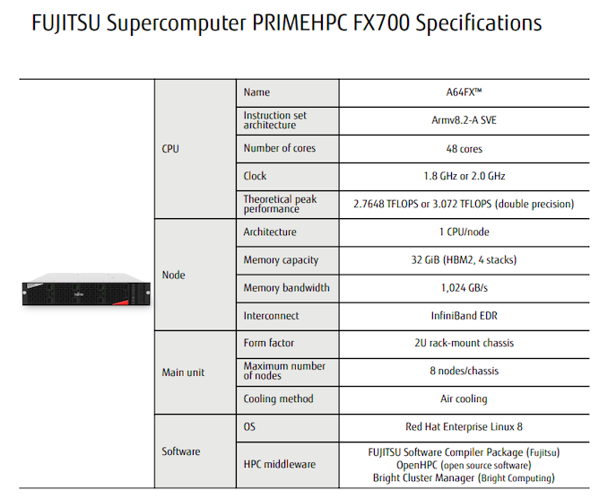 一直不清楚A64FX模块是否会在超级计算机销售之外的更大范围内使用,然而今天证实了这一点,总部位于日本的HPC Systems公司将提供一款富士通PrimeHPC FX700服务器,该服务器在2U的外形内最多包含8个A64FX节点(频率为1.8GHz),每个节点都搭配了512GB的SSD存储和千兆以太网功能,并有扩展空间(Infiniband EDR等)。目前HPC Systems 2个节点的价格为415530日元(约合39000美元),交易将持续到年底。