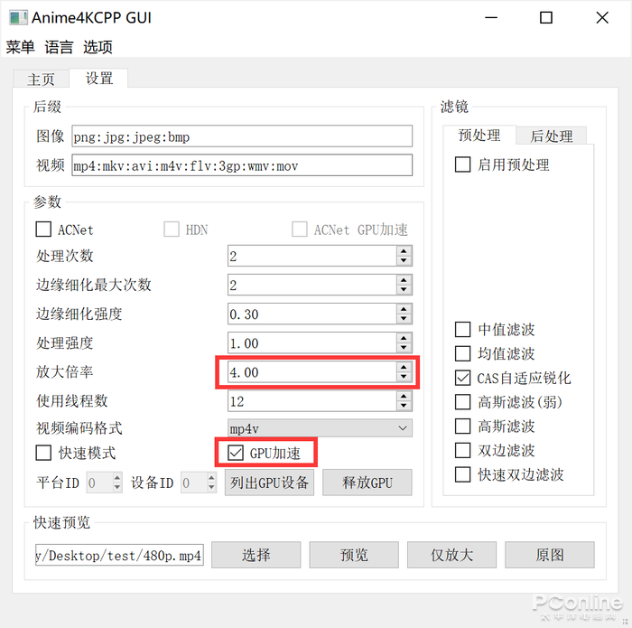 我们先来看看Anime4KCPP的一些设置项。在“设置”选项卡中,可以对很多参数进行设置,这里需要重点关注的是“放大倍率”以及“GPU加速”。“放大倍率”主要是设置将视频放大多少倍,例如1080p放大到4K分辨率,放大倍率应该设置为“2.00”(长和宽都是原来的2倍)。而勾选“GPU加速”,则可以加快处理的速度。