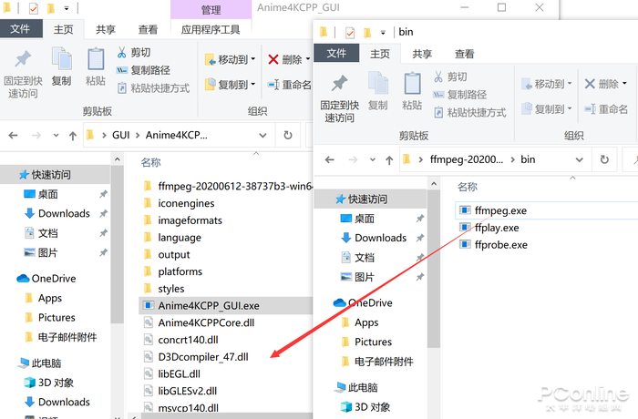 解压FFmpeg的压缩包,进入到其中的“bin”目录,找到“ffmpeg.exe”,将它复制到Anime4KCPP的根目录下即可。如果不做这一步,运行Anime4KCPP的时候可能会报错没有找到FFmpeg。
