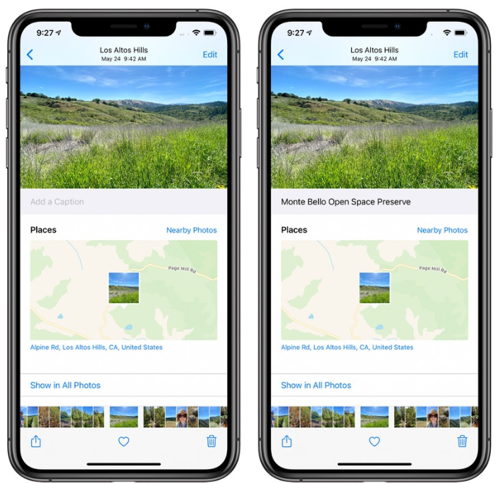 如果启用 iCloud 照片库,iOS 14 中的标题会在所有设备上同步,macOS Big Sur 中的描述字段已更名为标题,以保持连续性。