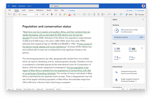 微软即将为 Word 编辑器引入“在线查重”功能,以帮助用户改善其写作风格。作为三月份预告的 Microsoft 365 更新的一部分,新功能将先向教育版订阅者推送,然后再分发给家庭和企业版订阅用户。据悉,该功能由必应提供支撑,可在显示文档内容的相似性比例,并使之更轻松地插入相应的引文。