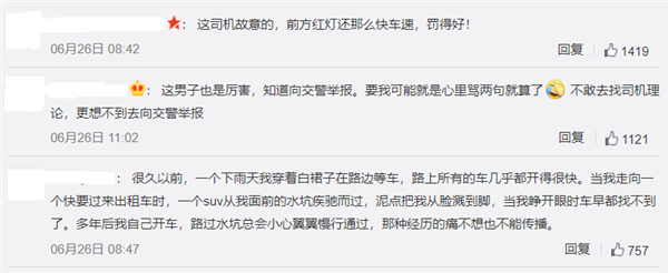 同时,也有网友分享了自己的在路边被过往车辆打湿的“惨痛经历”,从侧面也能够反映出,大家对于这种行为的痛恨。