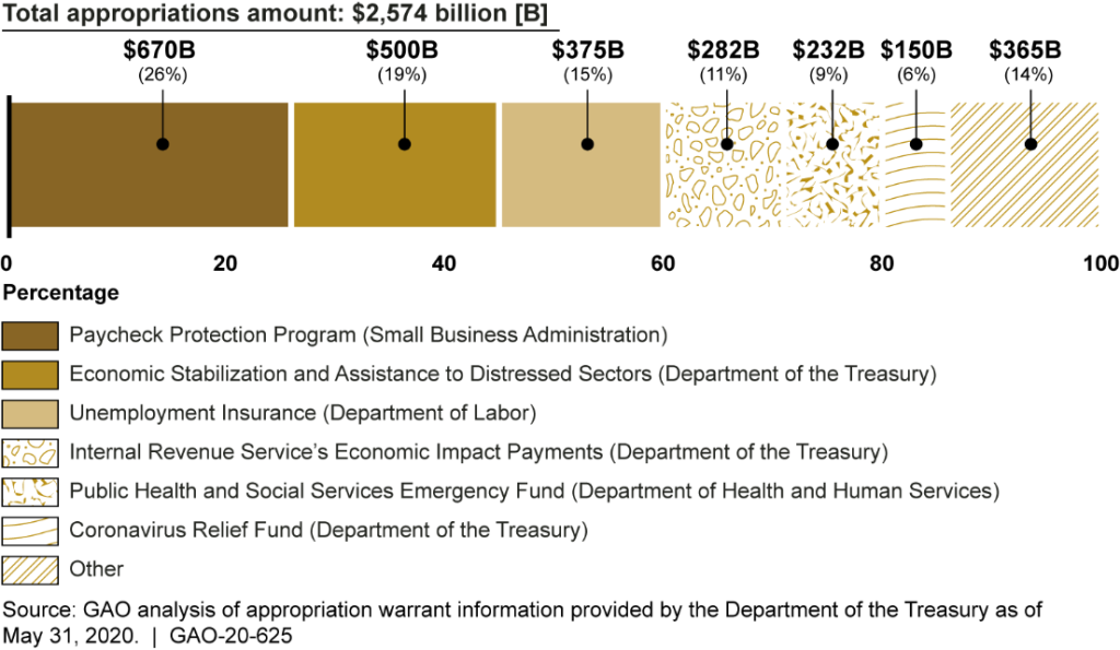 美国国会3月以来先后通过逾2.6万亿美元财政支出法案,救助受疫情影响的美国企业、纳税人及其家庭。
