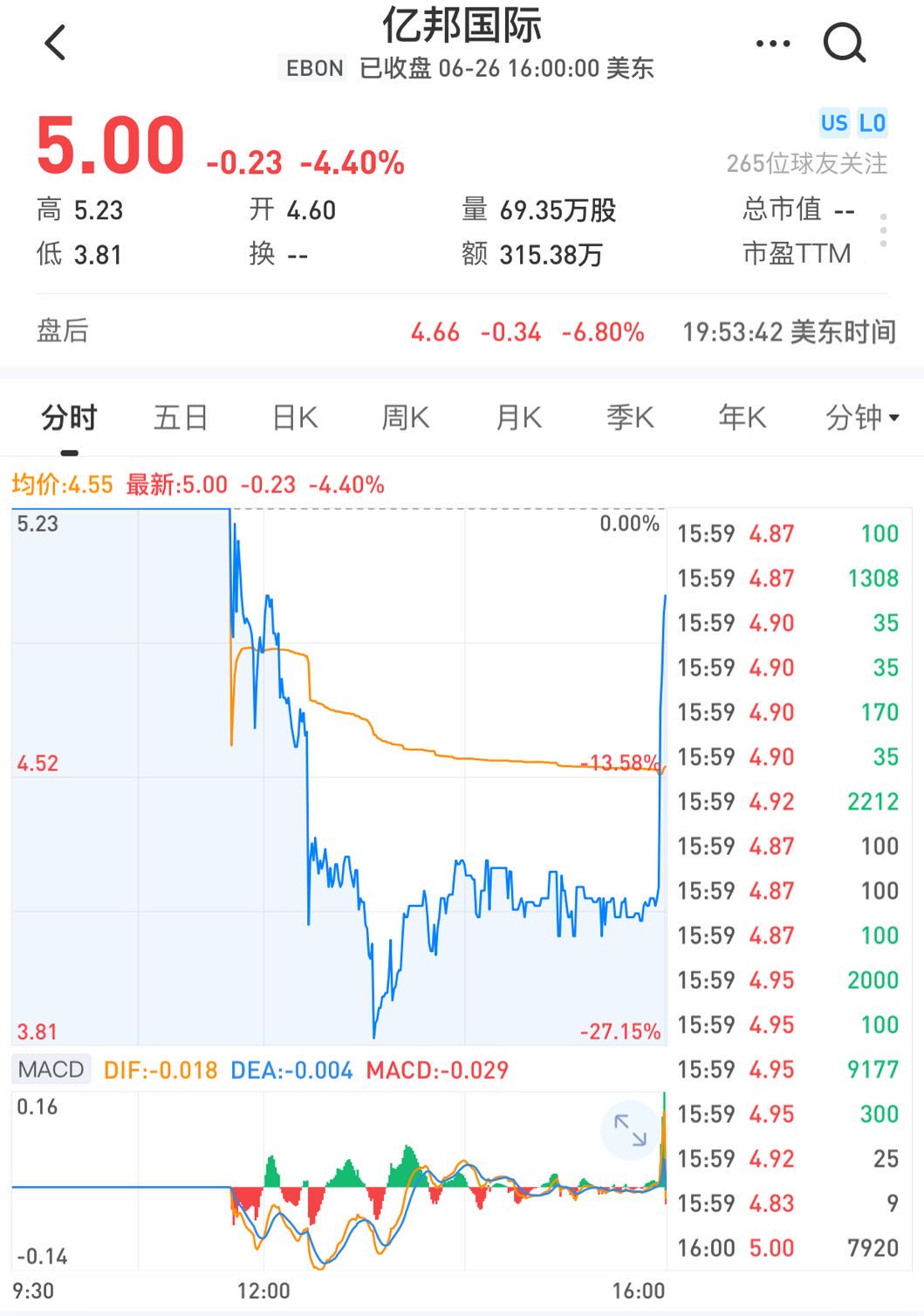 不过,亿邦国际在首个交易日就破发了。以4.6美元开盘后,股价即出现暴跌,盘中一度跌至3.81美元,但在收盘前又突然拉升,最终收于5美元,较发行价下跌4.4%,市值6.55亿美元,暂时高于行业老二嘉楠科技2.96亿美元的市值。