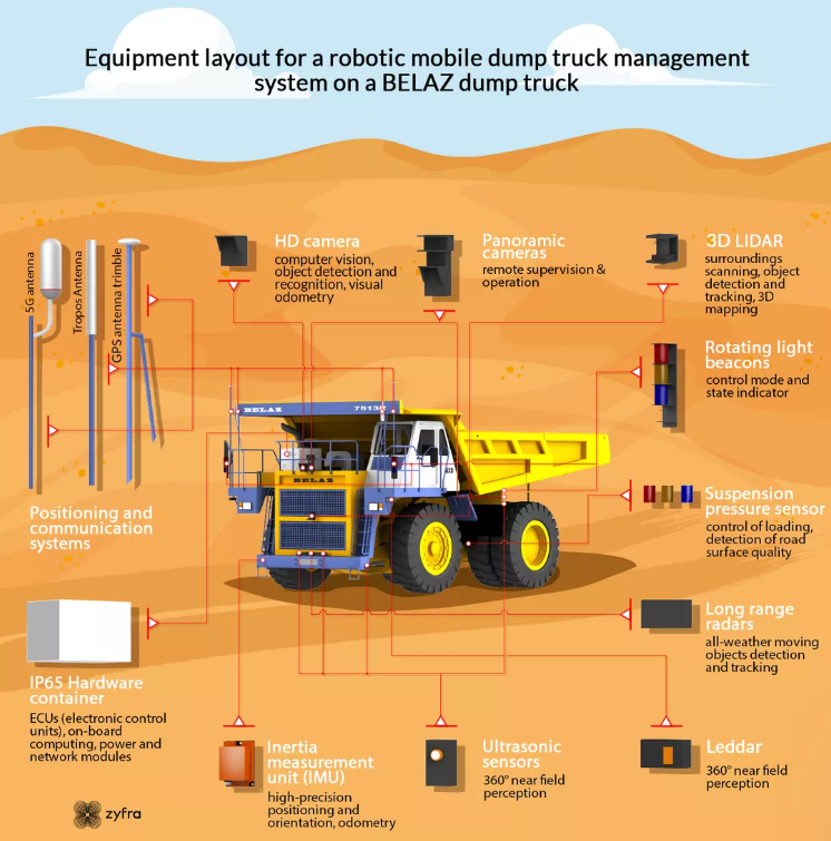 Zyfra专门为俄罗斯大型Belaz自卸车配备了一整套传感器生态系统,使其能够在俄罗斯Khakassia附近的Chernogorsky露天矿区范围内自主运营。本地化的5G网络是基于中国供应商华为的设备。