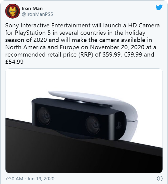 PS5 高清摄像头售价与 DualSense 手柄相同,为 59.99 美元、59.99 欧、或 54.99 英镑。