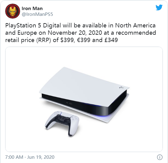 PlayStation 5 数字版也将于 11 月 20 日上市,售价为 399 美元、399 欧、或 349 英镑。