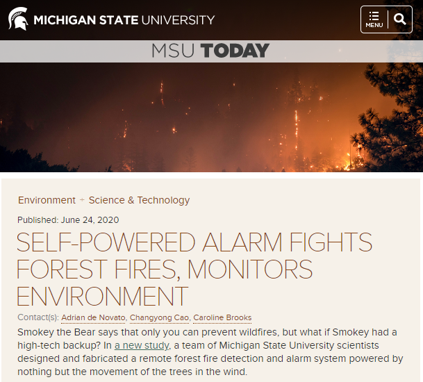 扑灭森林大火的最佳方法,就是将隐患扼杀在苗头阶段。于是密歇根州立大学的一支研究团队,就想到了为森林配备可检测与一氧化碳水平和高温等因素有关的传感器。需要指出的是,尽管此前大多数传感器都基于太阳能电池板,但该校的新方案却利用了树木运动所产生的能量。