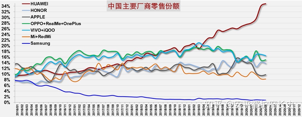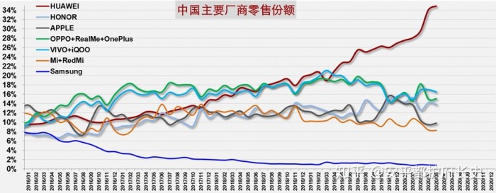 截止到2020年5月份,华为系的份额达到45.21%,其中华为31.30%,荣耀为13.91%,苹果为11.19%,OPPO系为15.91%,vivo系为16.43%,小米系为9.06%。