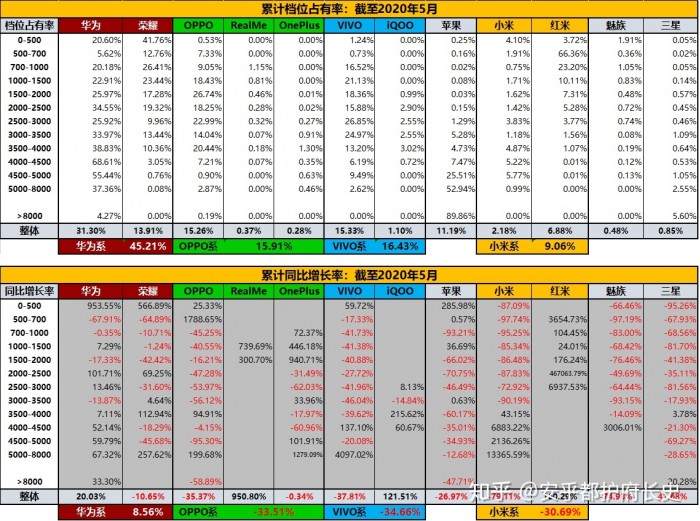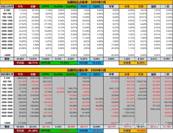 知乎大V@安乎都护府长史日前发布了2020年5月份中国手机市场零售档位情况,包括线下线上渠道,首先来看看5月份的情况。