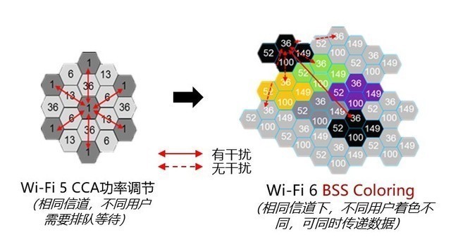 平时我们在家时,经常会搜到邻居的WiFi信号,这些信号会干扰到自家WiFi传输。而WiFi 6采用的干扰着色技术,可标记穿墙过来的邻居网络信号帧,让用户的路由器可以忽略它们。邻居间的WiFi信号可在同一信道同时传输数据而不互相干扰,降低干扰率30%。