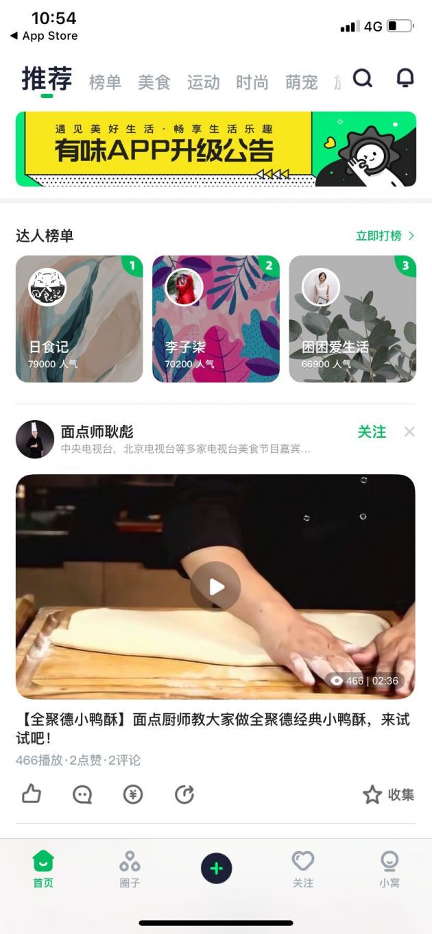 有味APP内有首页、圈子、关注和小窝(即个人主页)四大板块,用户可在产品内发布图文内容或视频内容。首页又分为推荐、榜单、美食、运动、时尚、萌宠、旅游、HOME八大模块,推荐类目中或根据算法来为用户推荐个人偏好内容。