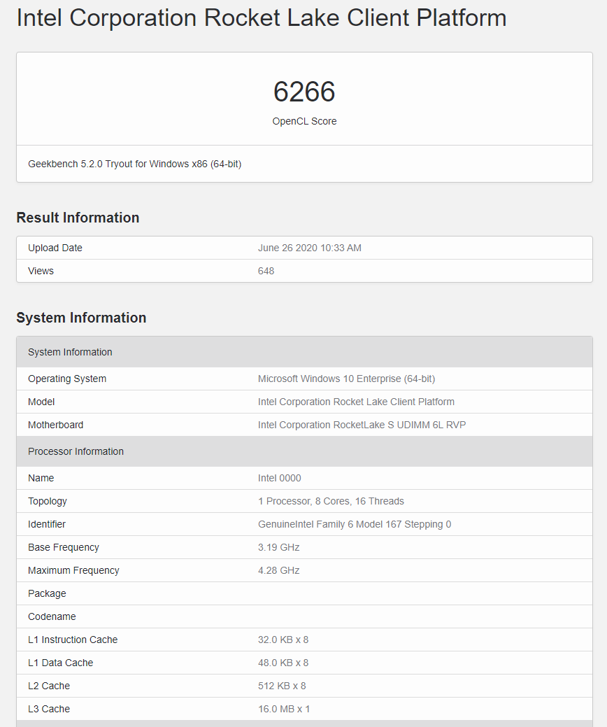 此前我们曾在3DMark数据库中看到过Rocket Lake 6核心12线程的工程样品,而现在GeekBench首次曝光了8核心16线程版本,这应该也是Rocket Lake的最高配置了,不会再有目前Comet Lake-S 10代的10核心20线程,原因据说是功耗发热控制不住。