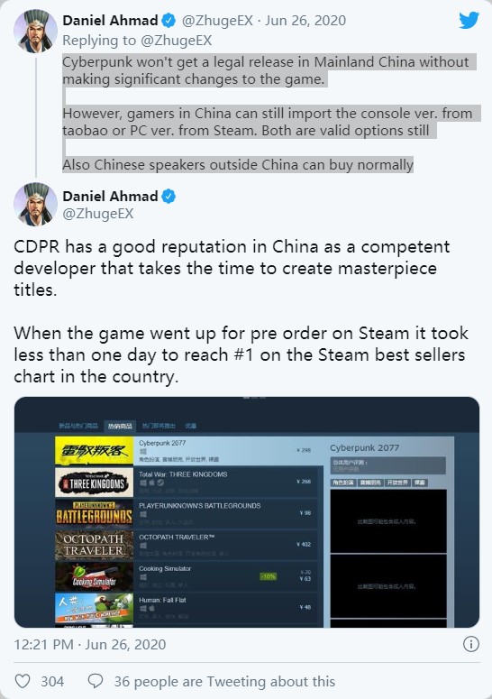 本月早些时候,CD Projekt市场总监的在LinkedIn上陈述《赛博朋克2077》来自中国的预定量“目前居于全球首位”(该内容已被删除)。丹尼尔认为这些销量仅仅是PC上的,虽然游戏在中国过审会遇到阻碍,但玩家可以通过steam或者淘宝购买,此外海外玩家也会贡献一部分销量(推特的主要意思)。