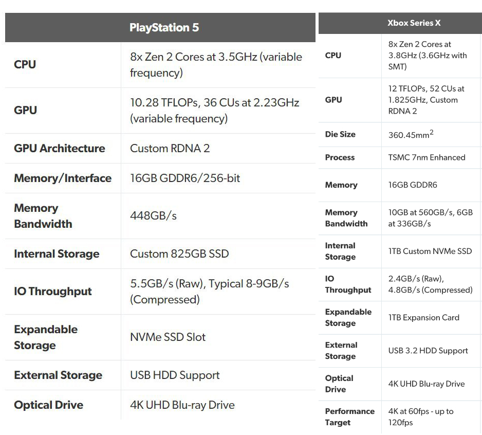 根据微软和索尼发布的官方数据显示,两台主机在配置方面各有千秋:Xbox Series X在性能上、特别是浮点运算能力方面更具优势;PS5则配备了超高速SSD。然而,在GPU方面拥有36个CU的PS5可以达到10.28TF的能力,看起来相比Xbox Series X的52个CU,12TF差距并不大。这其实与二者的频率有着很大的关系:PS5的GPU时钟频率为2.23GHz,而Xbox Series X仅为1.825GHz,但是PS5使用的动态频率,Xbox却是锁频。
