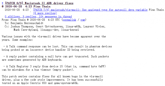 Finn 提交的 9 个补丁修复了 Linux 内核中支持 Macintosh II ADB 驱动的所有已知错误。