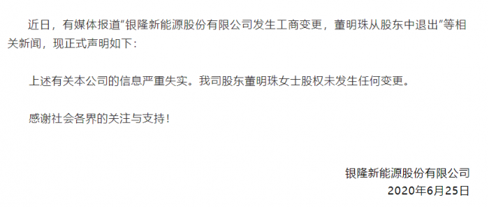 许久未在汽车圈发声的董明珠,近日因一则消息引起了业内人士的广泛关注。日前,有国内媒体报道,银隆新能源股份有限公司发生工商变更,董明珠从股东中退出。针对这一传闻,银隆新能源公众号发文声明,“近日,有媒体报道‘银隆新能源股份有限公司发生工商变更,董明珠从股东中退出’等相关新闻,上述有关公司的信息严重失实,公司股东董明珠股权未发生任何变更。”