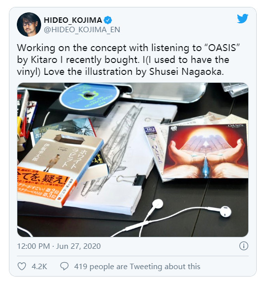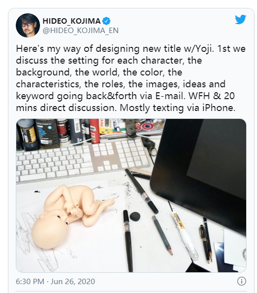 最近小岛在Twitter上发布了两条推文,被外媒解读为小岛可能在暗示《死亡搁浅2》或者是设定在同一个宇宙的完全新作。小岛最近发布了两条推文,每个推文都有配图,展示了自己在家工作的最新进展。第一条推文是:“和新川洋司设计新作,我的方式是这样:首先我们通过邮件反复地讨论每个角色的设定,背景,世界,颜色,性格,角色,图像,想法和关键词。在家里工作,每天只有20分钟的直接交流。大部分时间是通过苹果手机短信交流。”