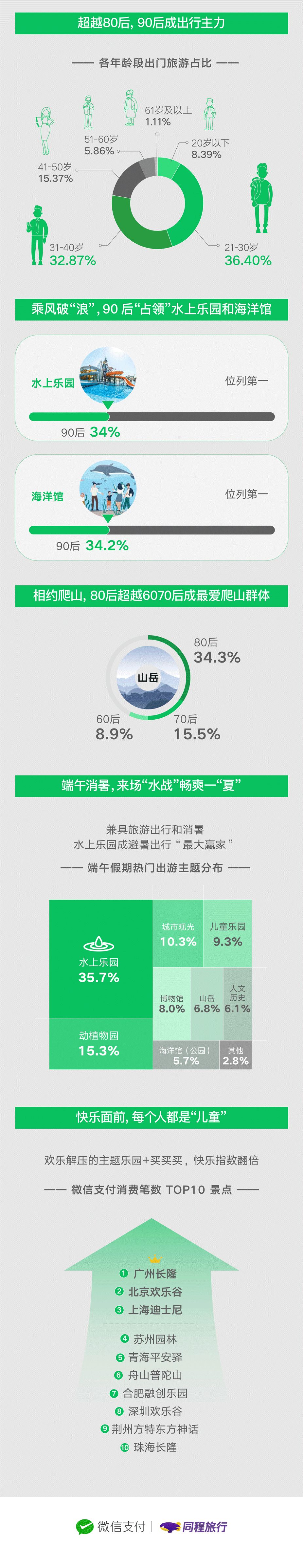 端午假期旅游消费大数据还显示,90 后首次成为假期出游“主力军”,占比达到 35.4%,超过了 80 后和 70 后的 32.87% 和 15.37%。此外,不同年龄层的消费者的假期旅游消费偏好存在一定差异。例如,90 后是水上乐园和海洋馆的消费主力,80 后相比 60 后、70 后更偏好山岳类主题。