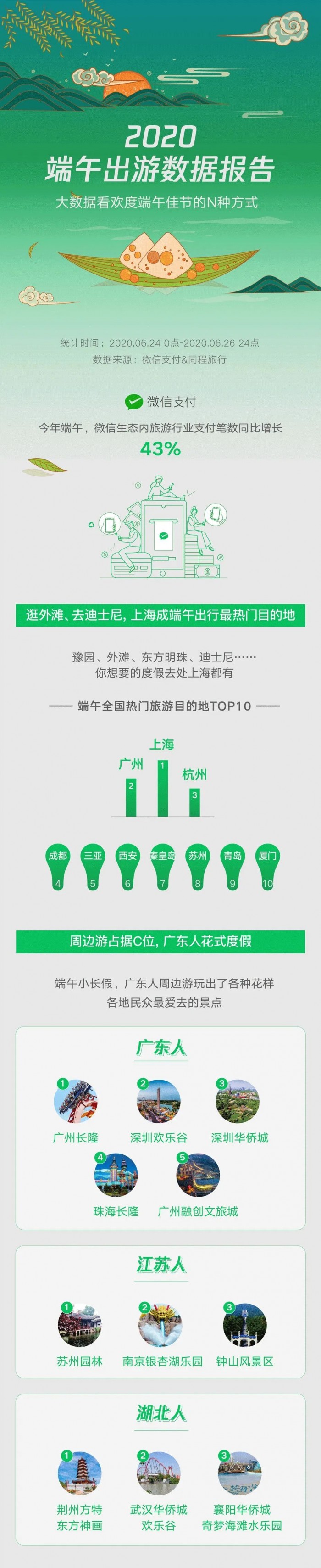 具体到不同城市、不同景点和不同人群,端午全国热门旅游目的地前十名依次为:上海、广州、杭州、成都、三亚、西安、秦皇岛、苏州、青岛、厦门;周边游成为今年端午假期的新主题,并且不同地区的出游主题的偏好存在差异。例如,广东地区最受欢迎的主题是广州长隆、深圳华侨城、各类主题公园;江苏地区最受欢迎的是园林及风景名胜区等,例如苏州园林、南京银杏湖乐园、钟山风景区等等。
