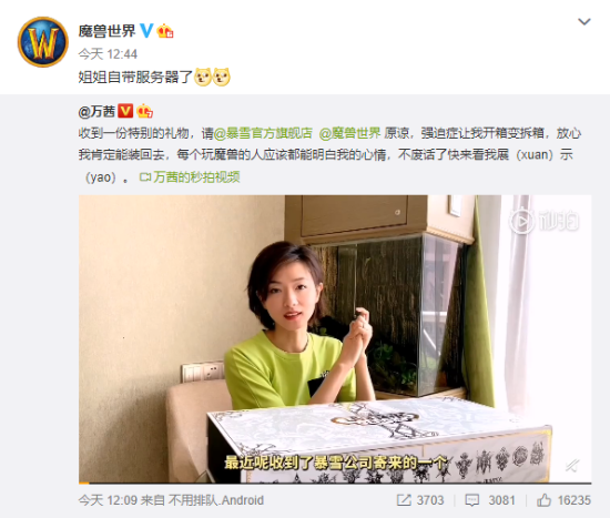 演员@万茜收到了暴雪赠送的《魔兽世界》退役刀片服务器,并且分享了她的开箱视频。作为《WOW》老玩家的万茜,收到这一礼物后非常高兴,在视频中迫不及待地想要炫耀每个部分。同时她也在视频中分享了自己的《魔兽世界》中守尸、部落联盟大战的经历,详情可以访问视频中查看。