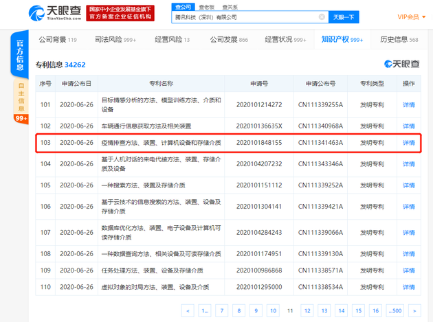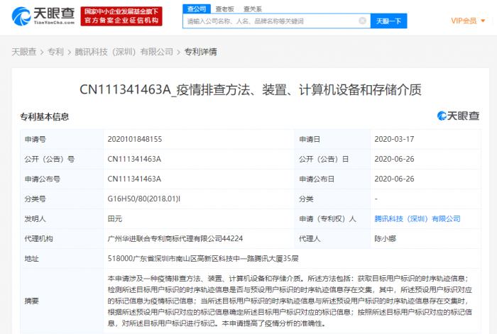6月29日消息,据天眼查数据显示,近日,腾讯科技(深圳)有限公司申请“疫情排查方法、装置、计算机设备和存储介质”的发明专利。摘要指出,本申请涉及一种疫情排查方法、装置、计算机设备和存储介质,提高了疫情分析的准确性。