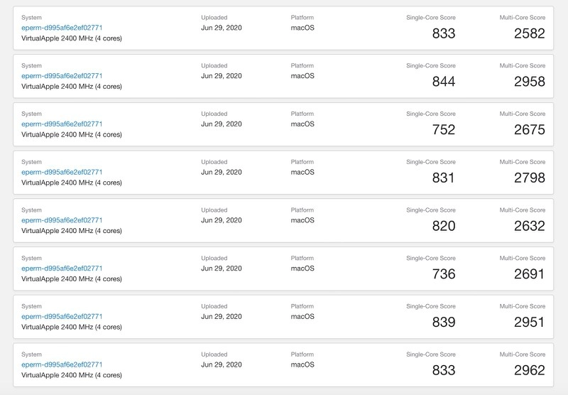 在Geekbench 5的线上数据库中找到的 "VirtualApple"的结果显示,带有 "emperm-d995af6e2ef02771"名称的一台苹果Mac系统被认为是DTK的标识符。