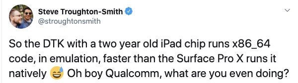 根据开发者 Steve Troughton-Smith 提示,Mac mini 中搭载的这颗 A12Z 芯片是苹果 2 年前的作品,但其性能已经击败了微软 ARM 芯片 Surface Pro X,而且 A12Z 还是通过 Rosetta 2 转译的 x86_64 代码。Surface Pro X 运行的是原生 ARM 应用。
