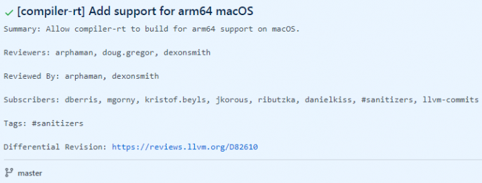 苹果已经开始将 ARM / macOS 11 的部分变化提交给上游 LLVM/Clang,后者是该公司的默认编译器工具链。LLVM/Clang 编译器堆栈也合并了苹果的提交,包括 ARM64 macOS 对 Compiler-RT 和其他最近的 commit 的支持。由于 LLVM/Clang 是 macOS 的默认编译器,也为 Xcode 提供支持,苹果会全力推进让所有必要的支持变更快速提交到上游。
