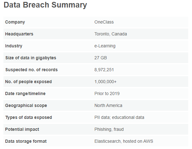 vpnMentor估计,此次曝光的OneClass数据库包括近900万条总记录。其总大小约27GB,足以存储超过200万个整页的文本。