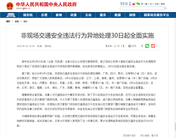 此外,官方还表示,为确保异地处理全面顺利推广实施,公安部交管局已组织升级非现场交通安全违法行为信息系统,开展业务培训,部署各地做好实施准备。试点实施以来,已有30万驾驶人享受到了这一改革红利,累计处理跨省异地非现场交通安全违法行为62万起。