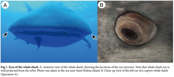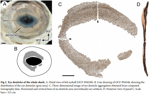 科学家们刚刚在对人类无害的鲸鲨身上发现了一个新的秘密 —— 这种可以长到 32 英尺(约 10 米)的海洋生物,竟然在眼球表面布有真皮细齿(dermal denticles)。尽管这种微小结构的观感与鳞片非常相似,但实际上却是真皮细齿,和鲨鱼皮上类似砂纸的粗糙纹理一样(也由真皮细齿构成)。