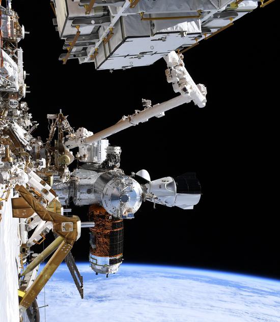 贝恩肯在Twitter写道,“昨天卡西迪在我们的工作地点@拍摄到关于载人龙飞船和日本宇航局HTV货运飞船的清晰照片。工作时看风景还不错……”