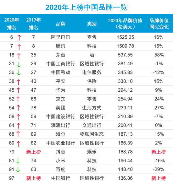 与去年相比,今年上榜的中国品牌由于抖音和中国银行(第97名,137亿美元)的加入而达到了创纪录的17个。去年就在榜上的15个品牌中有11个实现了排名提升,只有四个排名下降了。