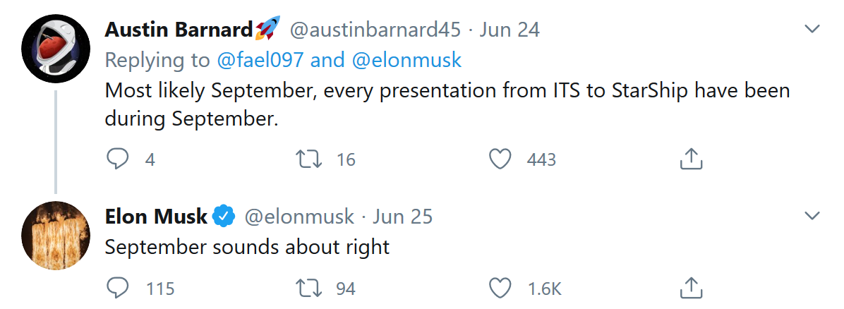 马斯克表示,它计划在今年9月份举行的星际飞船更新活动中,介绍该公司已经取得的实质性进展。