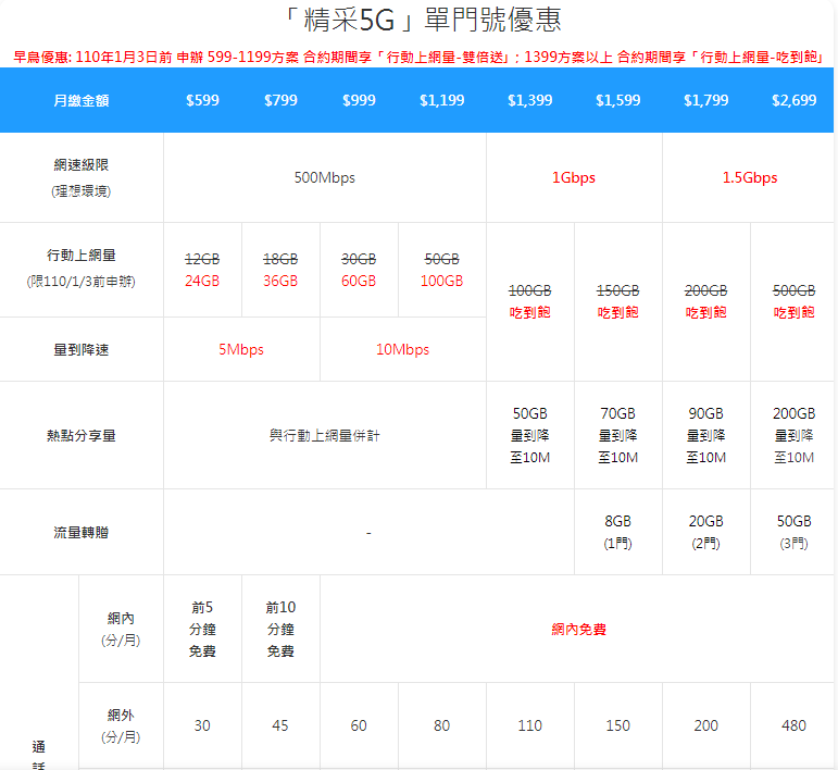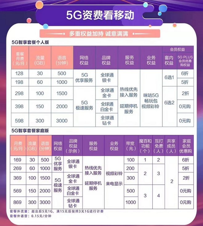 相比国内三大运营商去年首次发布的资费一览表(以下),台湾运营商在入门级别收费较高,约合 144 元的资费仅 24GB 流量;但在高端级别,台湾运营商 5G 极限下行速率更高,且只限速,并没有套餐外流量收费,在通话方面也能做到网内免费。