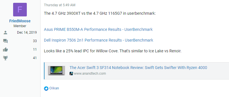 考虑到是同频率,25%的领先意味着Intel的10nm+工艺Willow Cove架构要比7nm Zen2架构的IPC性能超过25%,这可是个很大的差距了,哪怕10nm工艺高频率再不济,如果有25%的IPC优势那也很无敌的。