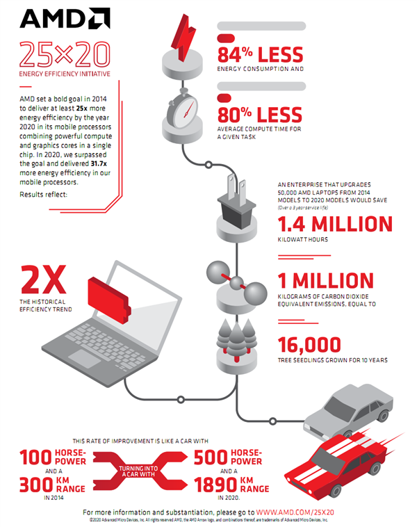 这意味着如果一家企业将2014年的50,000台AMD笔记本全部升级成2020年的新款,会获得超过5倍的计算性能,而相关笔记本的能耗则降低84%。