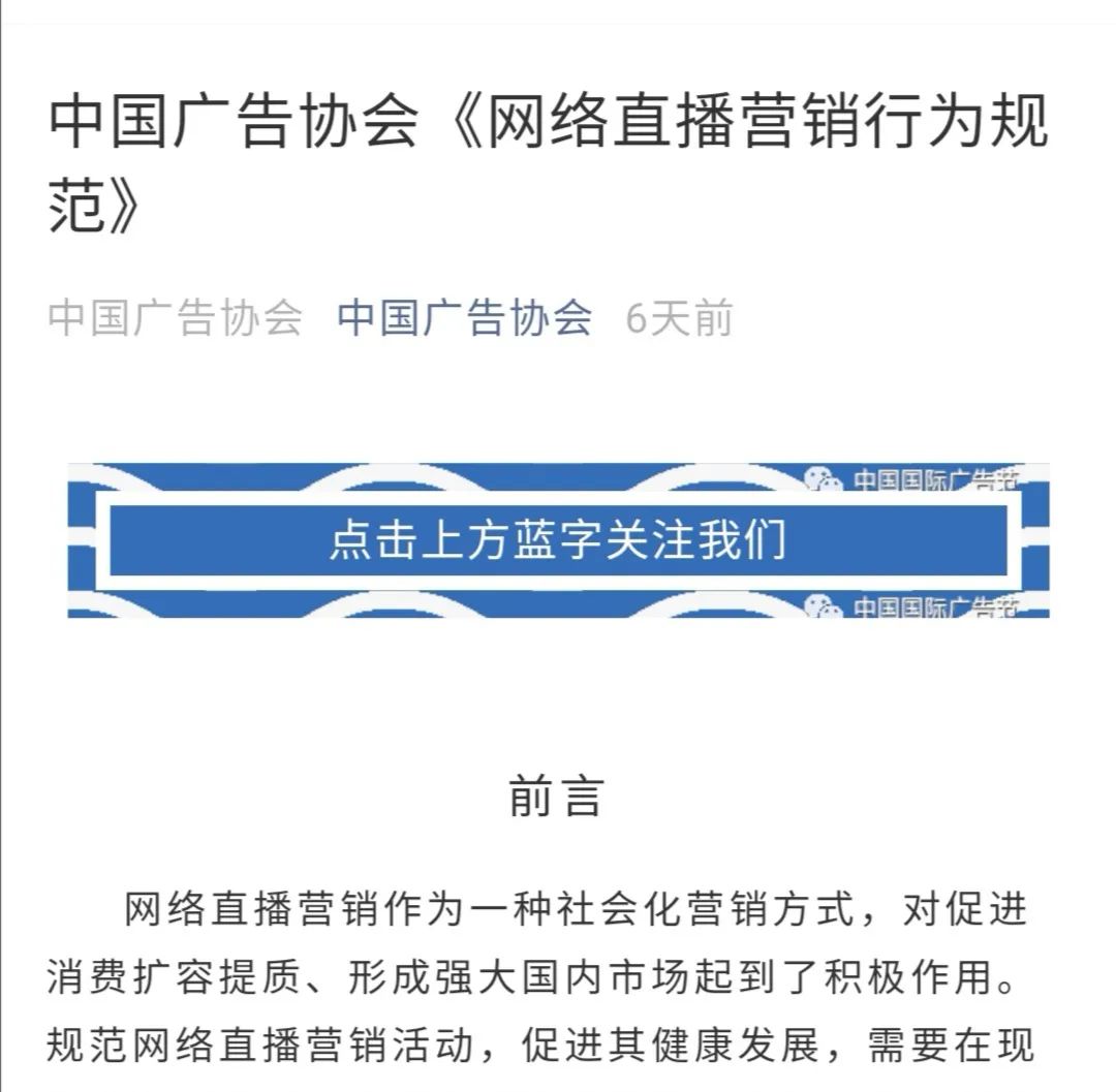 6月24日,中国广告协会正式发布了《网络直播营销行为规范》,规范共6章44条,这是首个针对直播营销行业的行业性自律规范。