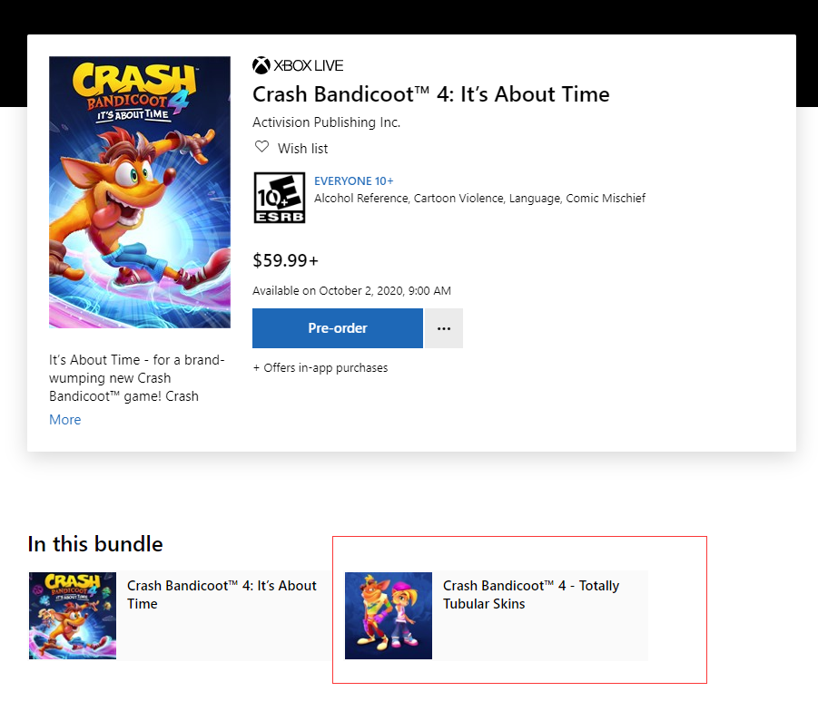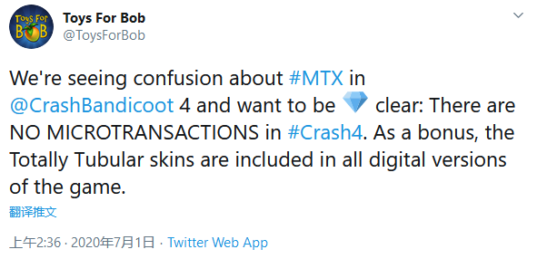 开发商Toys for Bob在推文中表示:“我们目前已经了解到大家对于《古惑狼4》微交易问题的一些困扰。在此,我们想要澄清一点:《古惑狼4》没有微交易,商城中显示的皮肤内容实际上是所有数字版都拥有的奖励。”
