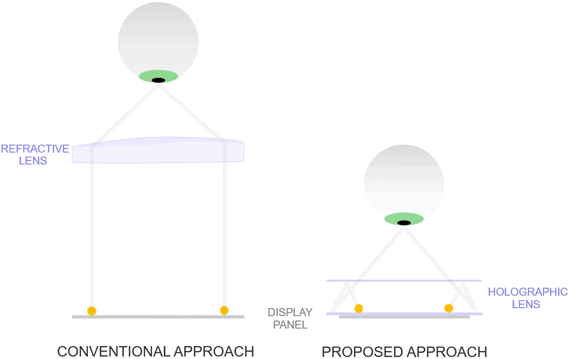 大多数VR显示器都有一个共同的观看光学元件:一个简单的折射透镜,由一块厚厚的、弯曲的玻璃或塑料组成。我们建议用全息光学技术取代这种笨重的元件。