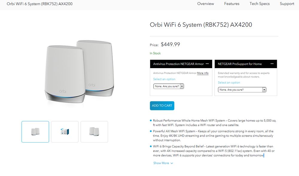 产品组合包括 1 台 Orbi RBR750 主路由器,以及 1 台 Orbi RBS750 子路由器,产品预估将会在今年 7 月上市发售,其中组合套装售价为 449.99 美元。